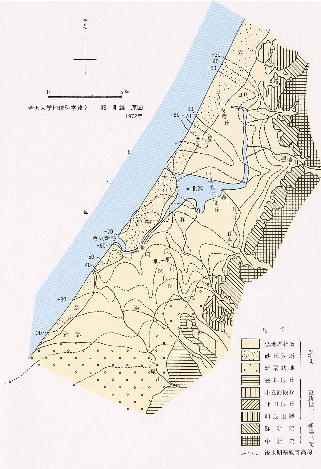D2:洪積世後期(砂層・泥層など),Dl:洪積世中期(礫・砂・泥層),Do:洪積世前期(卯辰山層),