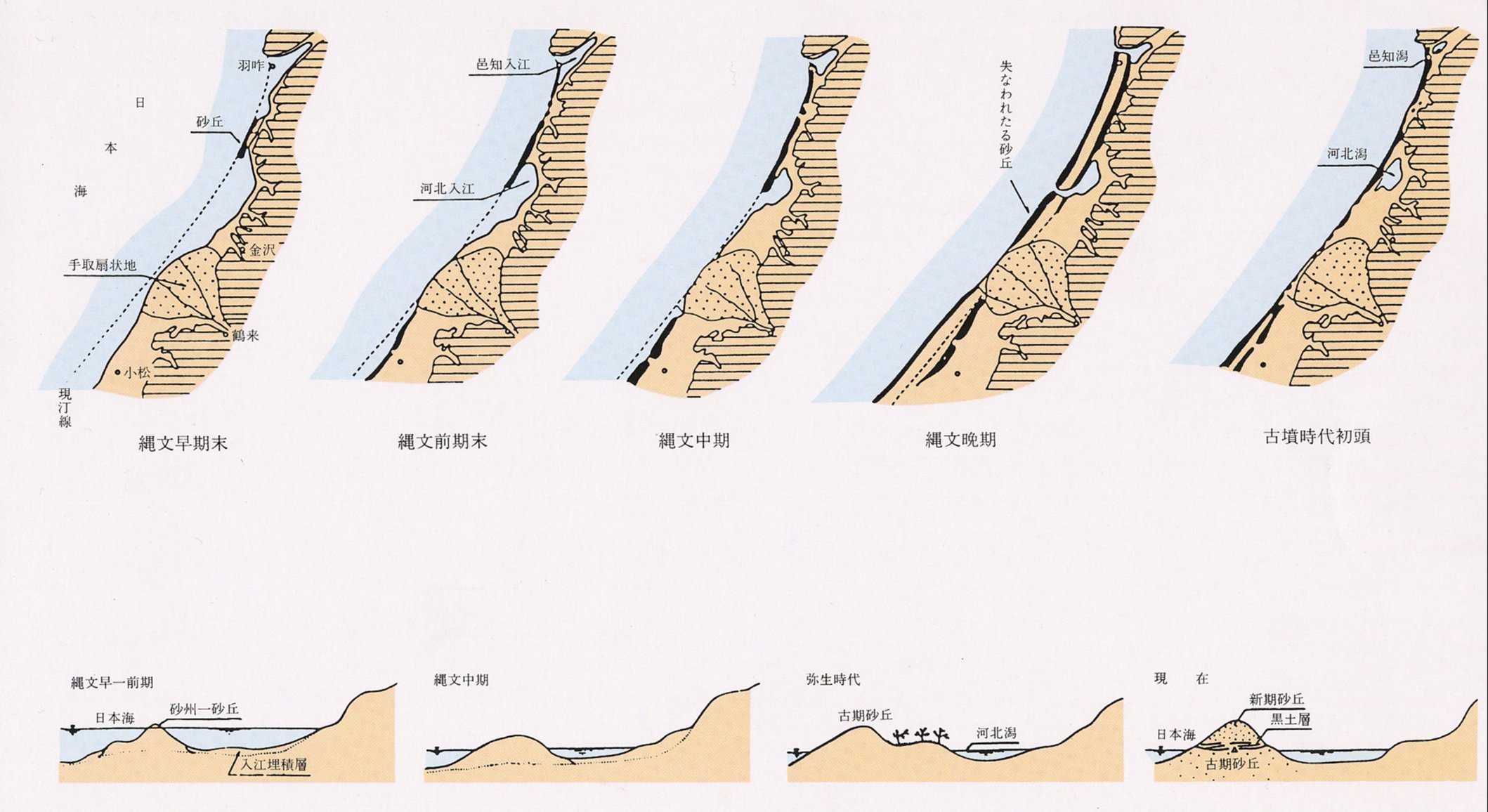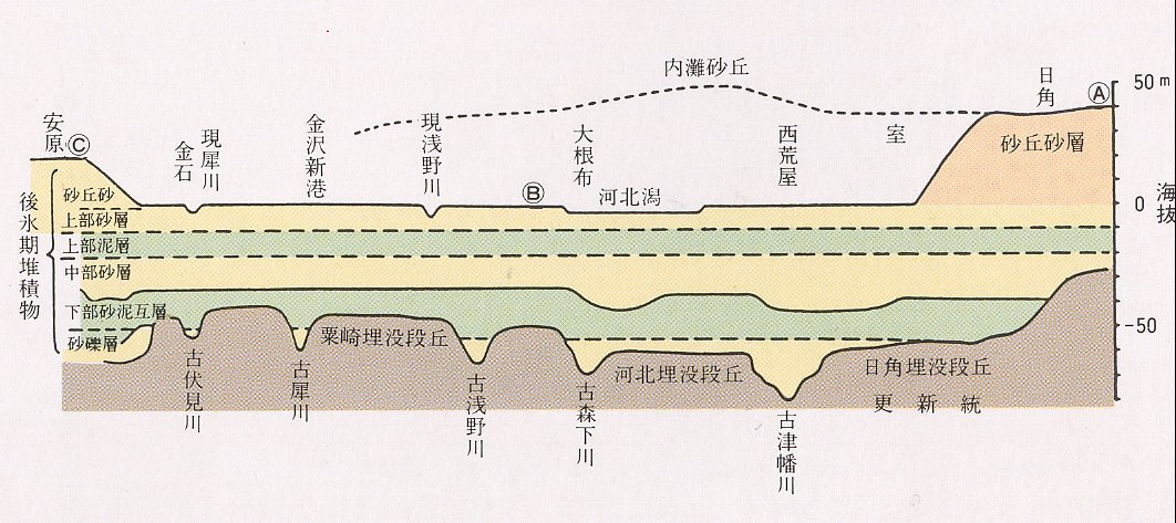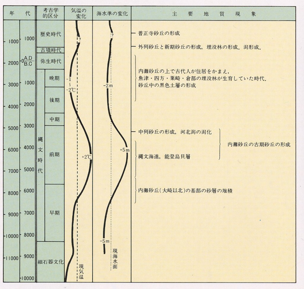 事業でつくられた河北潟放水路で、切り開かれた内灘砂丘が顔を出しており、一見何の変哲もない砂山に見えるが、大きな歴史を秘めているのである。 自然の偉大な力が、古い砂丘を作ってから、新しい砂丘をつくるまでの間、ここに、古代人が住居を構えていた事実が遺跡として発見されている。右ページの図面の黒土(厚さ30−50センチメートル)から発掘される黒津船、西荒屋などの砂丘遺跡がそれで、縄文、弥生、古墳の時代にまたがる。 そして、河北潟干拓地のボーリング調査で採取された地底の土の花粉分析から、縄文晩期、弥生の頃、今から2400年前すでに稲があったことも確認されている。 (以上の図、表は、藤 則雄、細野義雄、吉岡康暢、橋本澄夫編著の「金沢周辺の第四系と遺跡」から引用させていただいた。) |