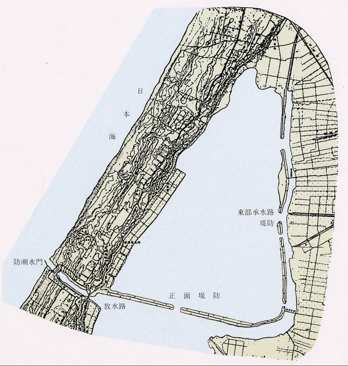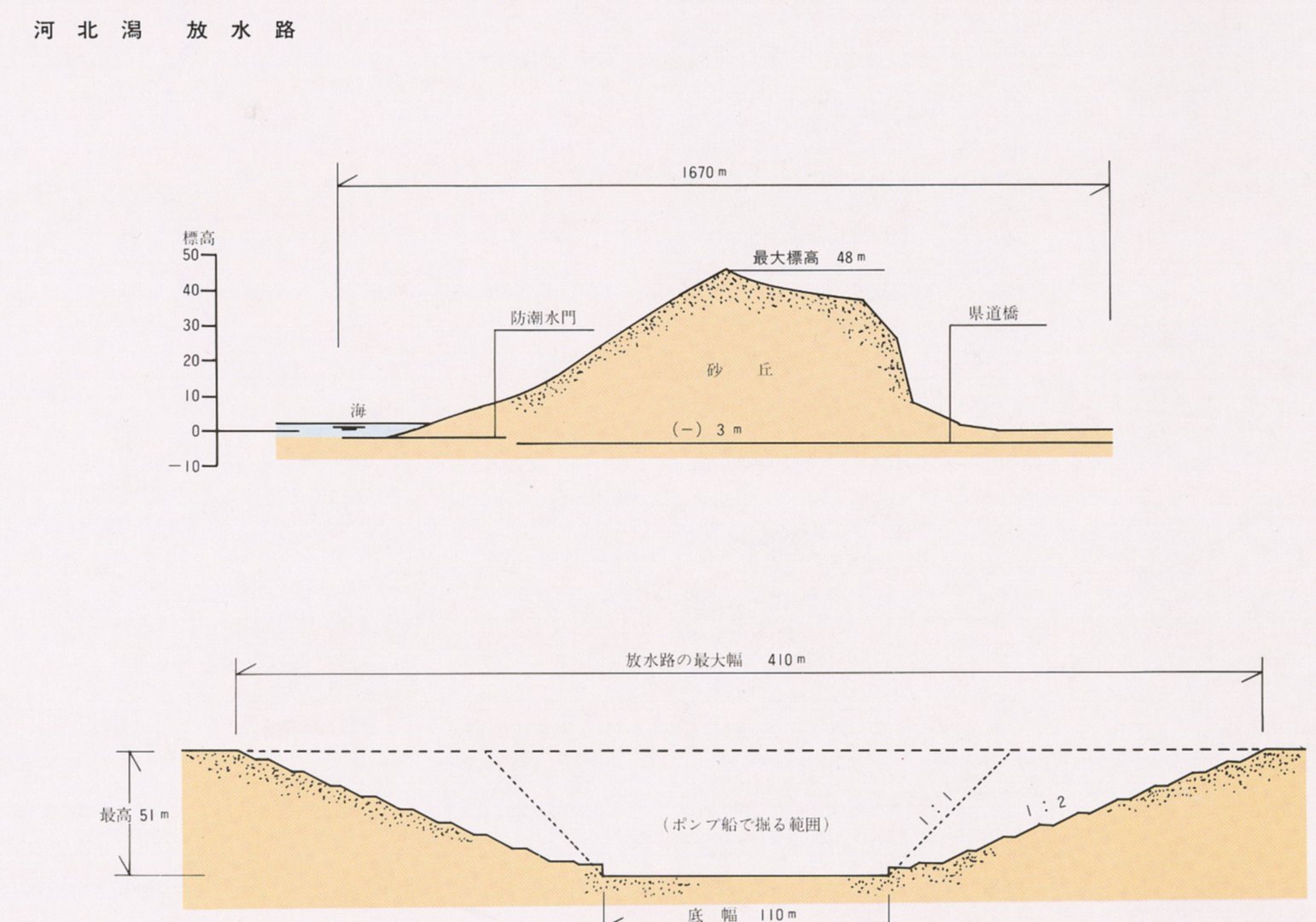 河北潟干拓のカナメは、砂丘地を切り開く放水路と、干拓地の締切堤防である。