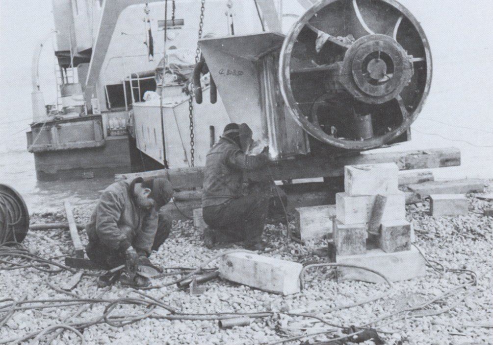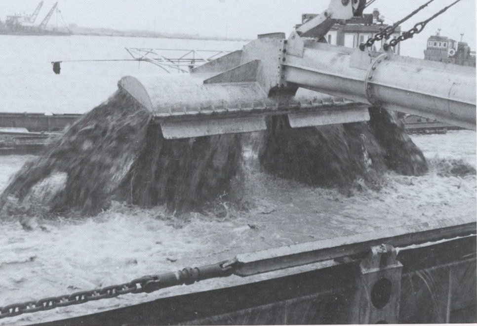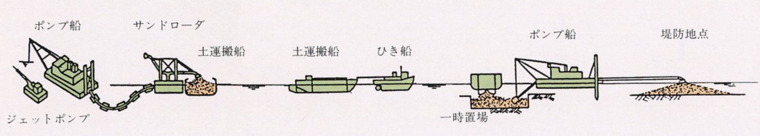 | 水面下のどろや砂をさらって取り除くことを浚渫という。ポンプ船の正式な名前はポンプ浚渫船で別名サンドポンプ船ともいう。水中に突き出したカッターを、土の中に押しこんでグルグル回す、と同時にそのどろ水を強力なポンプで吸いこむ。吸いこんだどろ水はパイプではき出されるが、このパイプを何本もつなげると、かなり遠くまで送れる。 このポンプ船は、日本海から大野川を通って潟に入るが、途中に橋などがあって、あまりに大型のものは入れない。右上の写真は、河北潟で活躍した600馬力のポンプ船で、1年間、1,800,000立方メートルの能力をもっている。