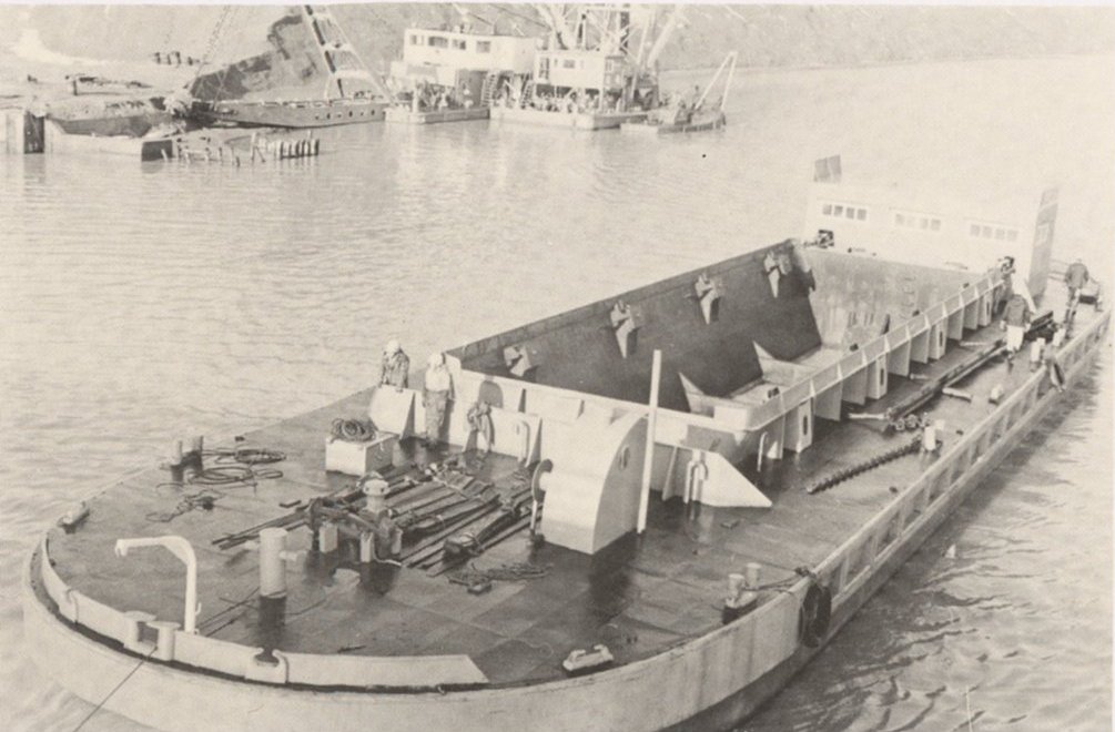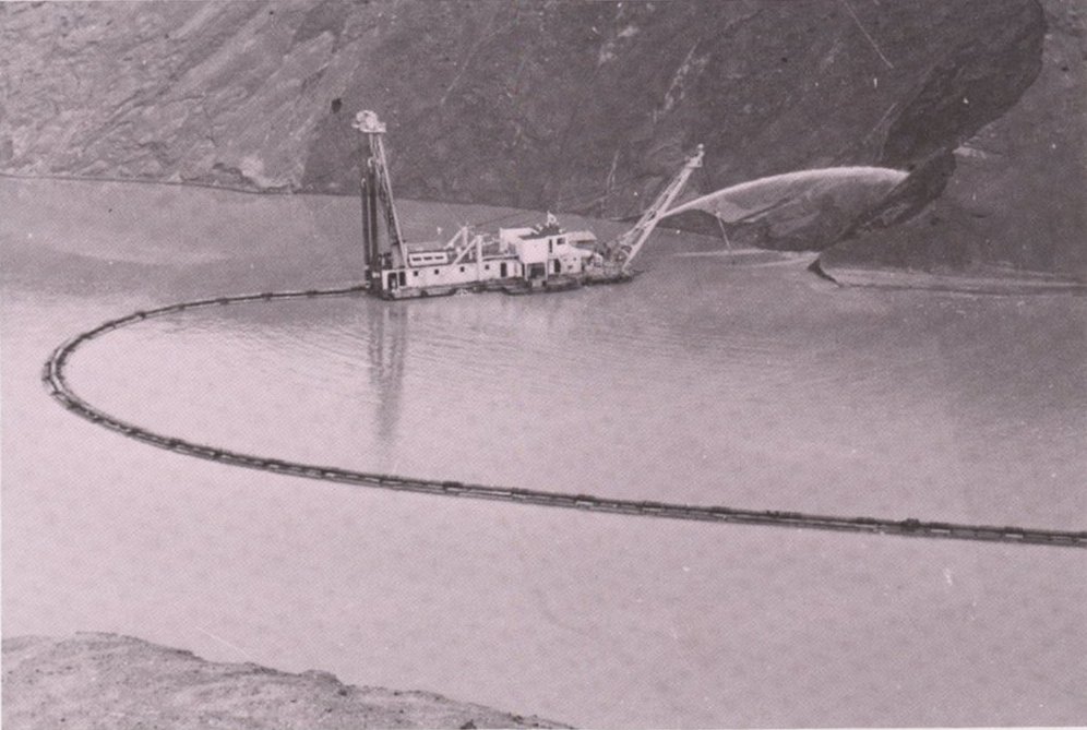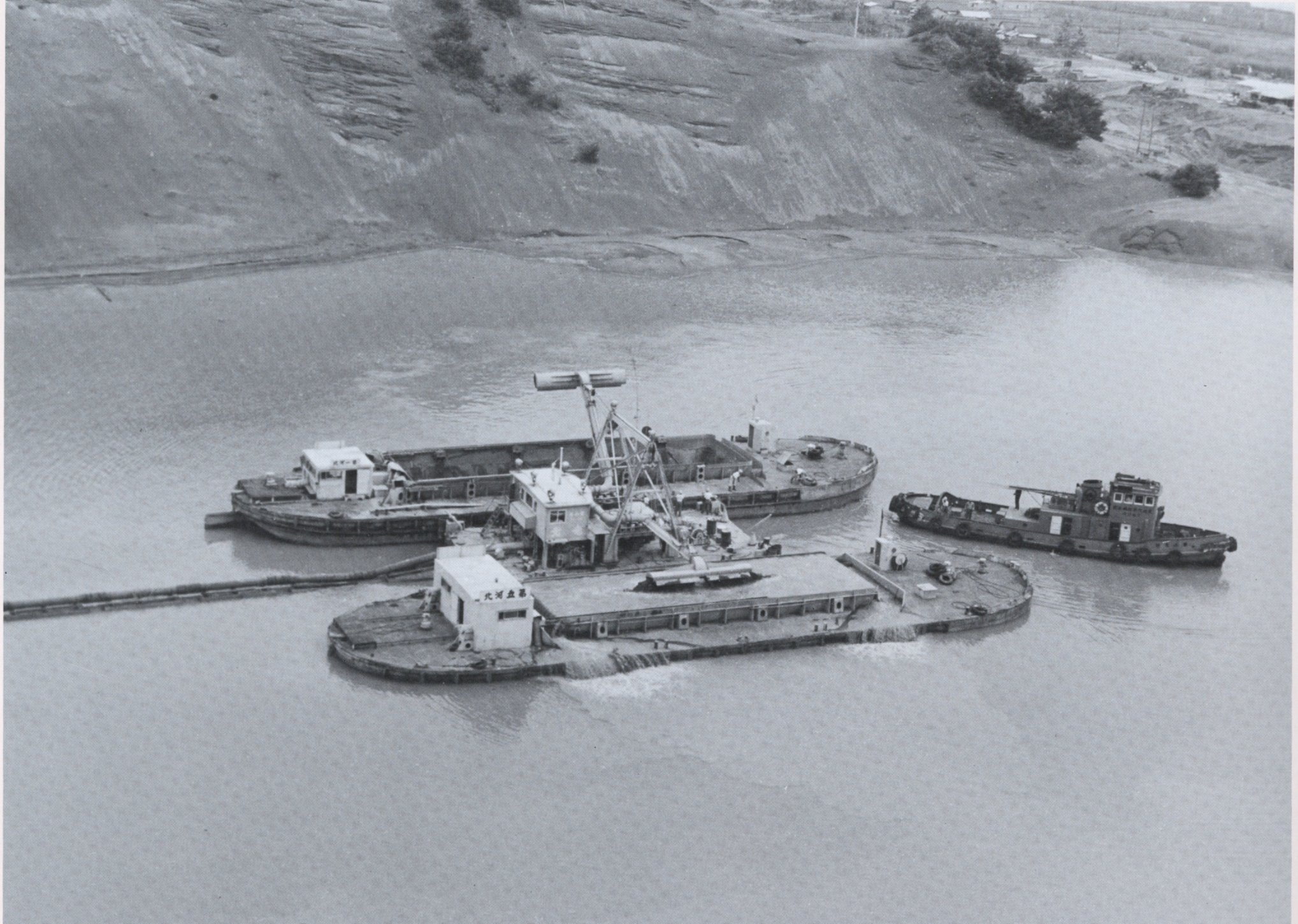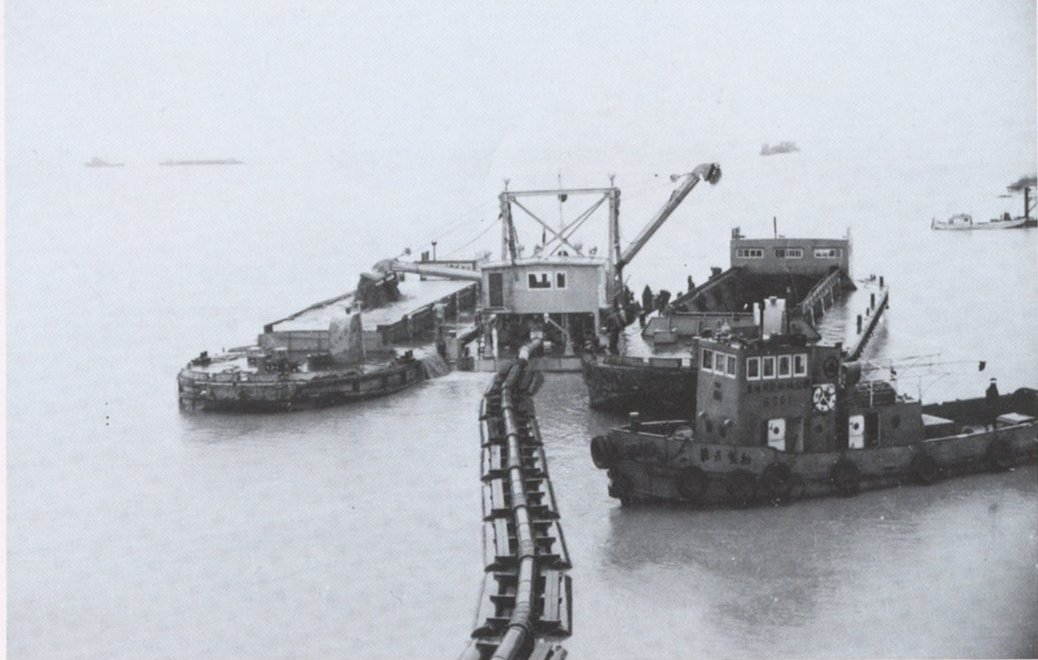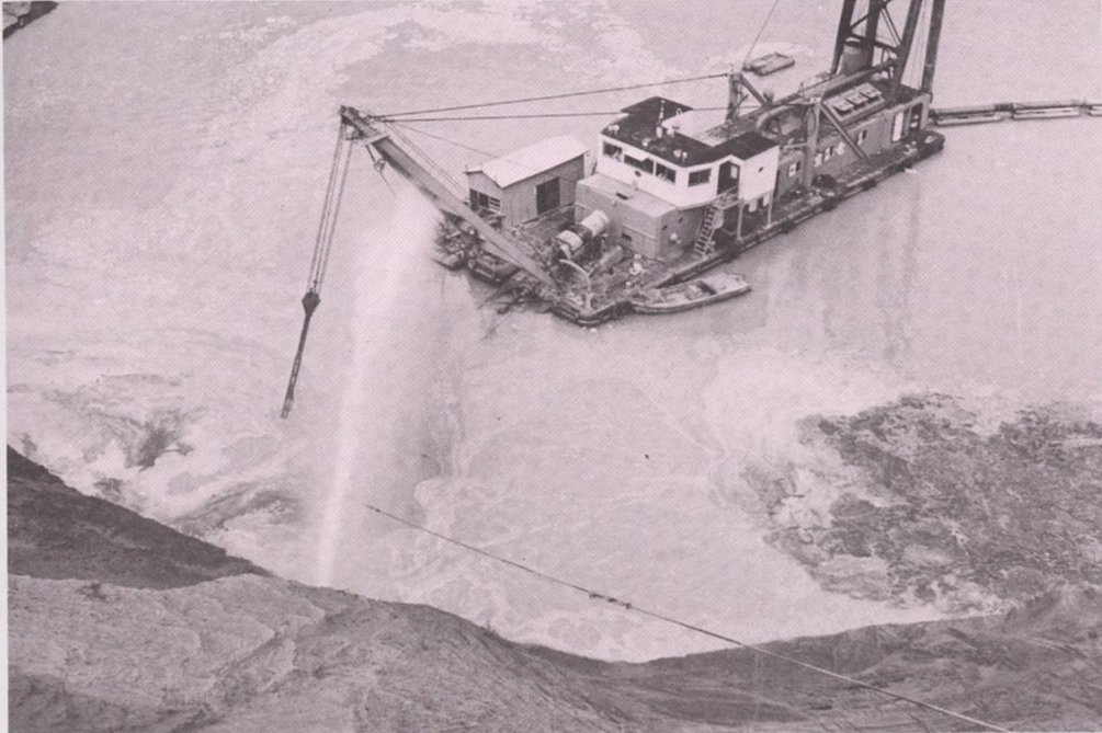 ジェットポンプがくずした砂丘の砂をポンプ船で掘って吸い上げる。 |