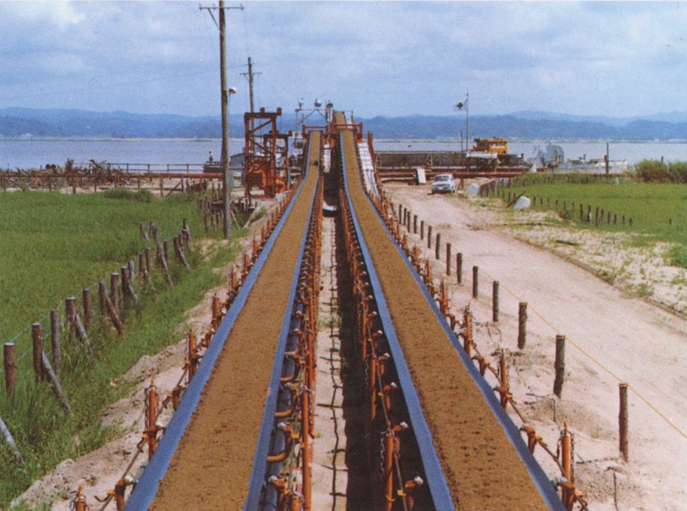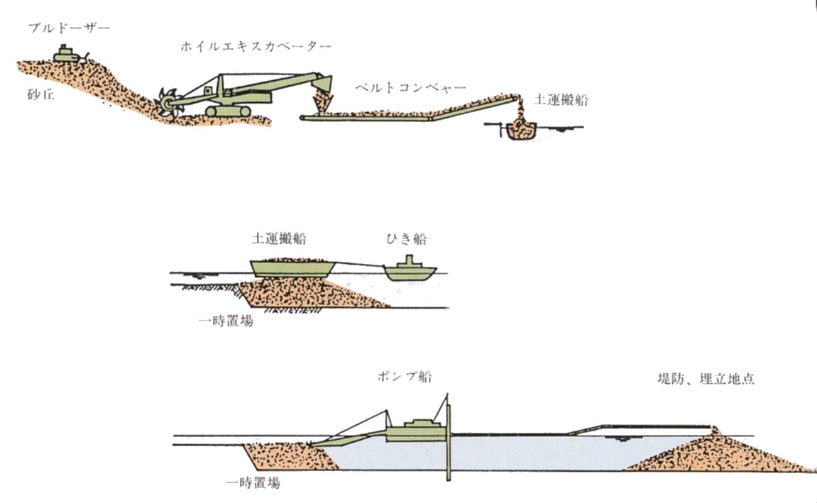 堤防、宅地造成ともに工事の内容は正面堤防や、東部承水路と変わらず、ポンプ船が主体となること、大量で、かつ値段の安い土が手に入る等の理由から、大崎地内の砂丘地を選んだ。ただし、放水路の場合と違って、土取場は陸上作業となるため、ブルドーザーや、ベルトコンベア一等の陸上機械も活躍したのである。