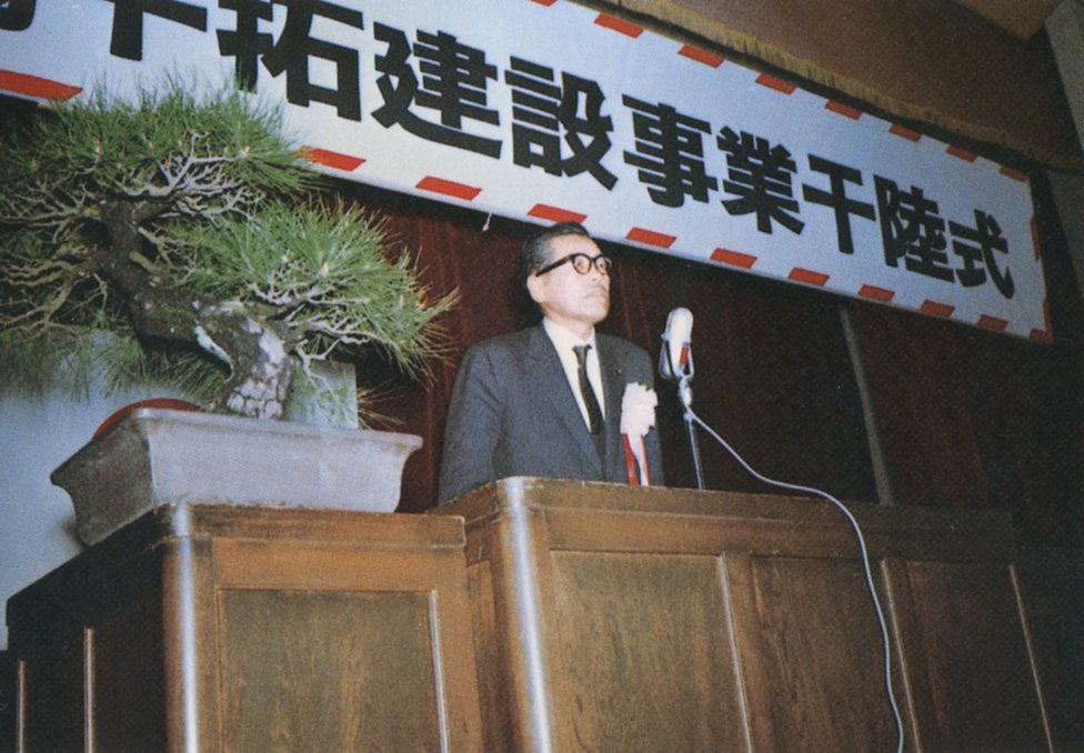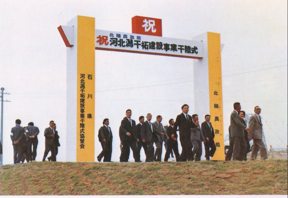 大学と進まれた農業土木の先達で、農林省の組織が農林水産省に、金沢農地事務局が北陸農政局とかわった時、農林省農地局長から初代の北陸農政局長になられた、ちょうど、昭和39年に起工式の行われたころである。 |