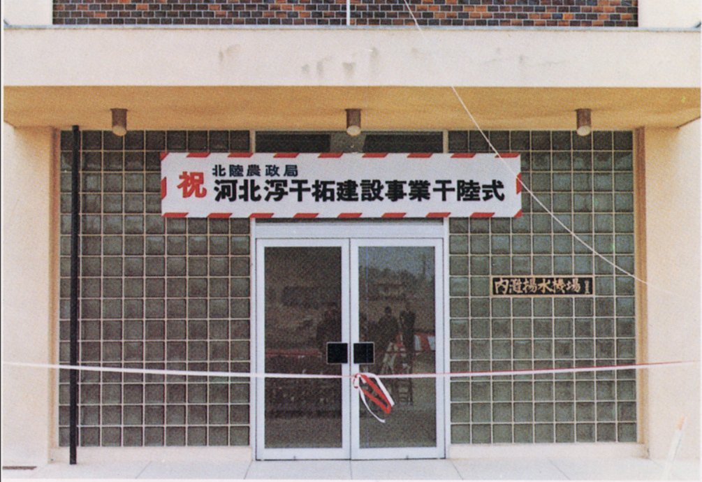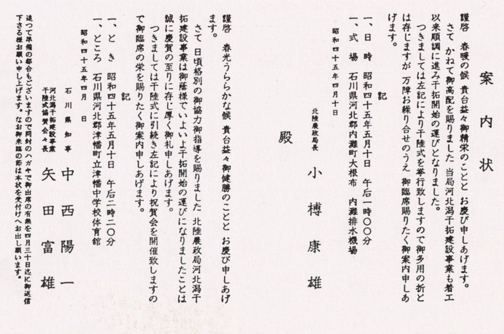 潟縁周辺の排水改良事業。 長い長い歴史を秘めた河北潟に、干拓の輪郭を示す堤防が水面上につらなり、放水路、防潮水門も完成した。そして、内灘ポンプ場のスイッチが入れば、干陸の開始である。 昭和45年5月10日、内灘ポンプ場と、津幡中学校体育館を会場に「干陸式」 が挙行された。右上の写真は、内灘ポンプ場に設けられたアーチ。下は、干陸式の案内状である。