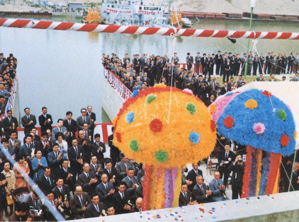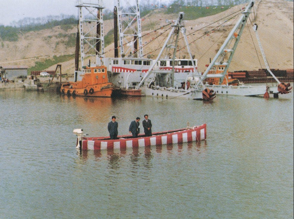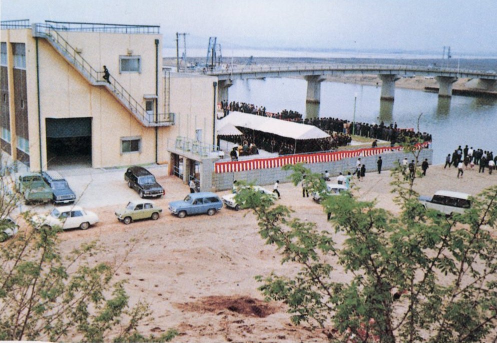 | 去る昭和39年8月18日、津幡中学校の体育館で「河北潟干拓建設事業」の起工式が行われた。それから4年8ヶ月、営々と続けられた放水路、締切堤防、