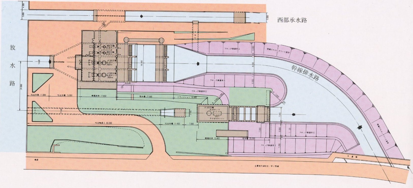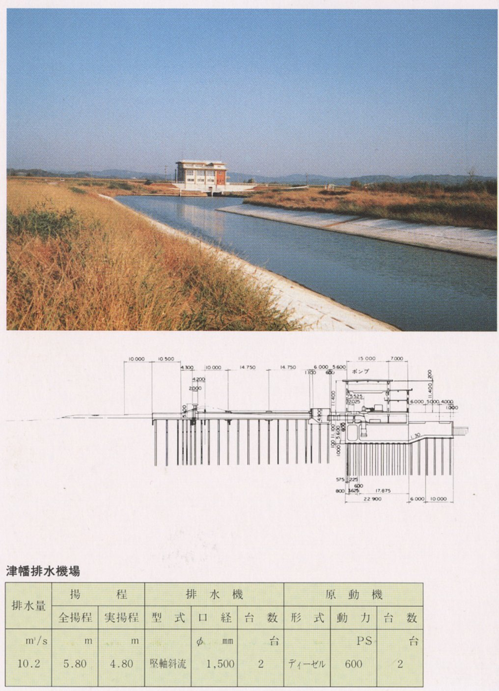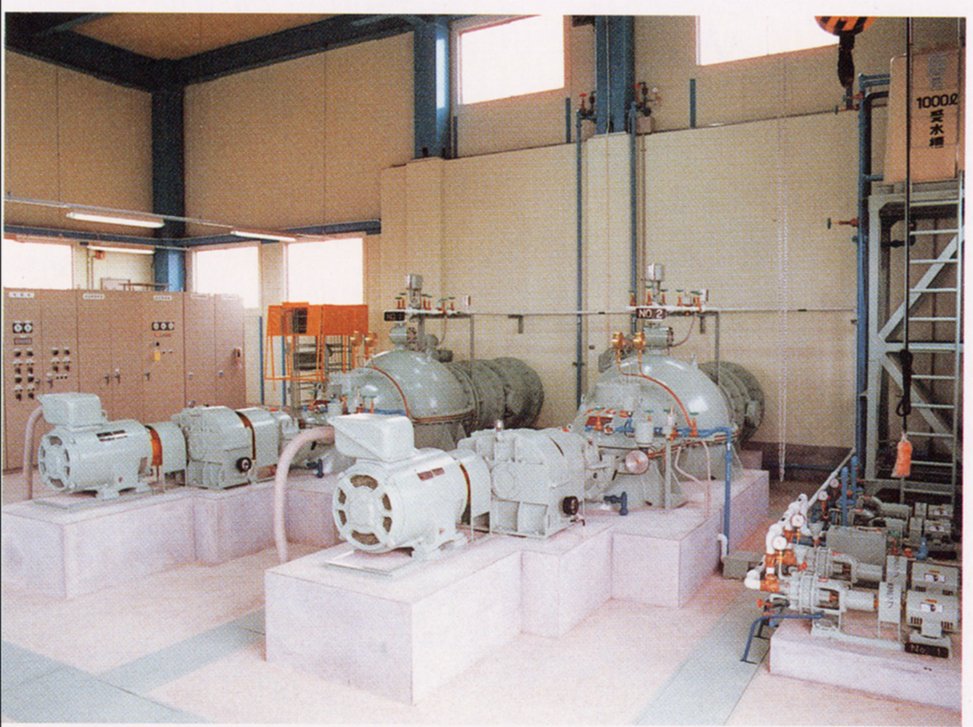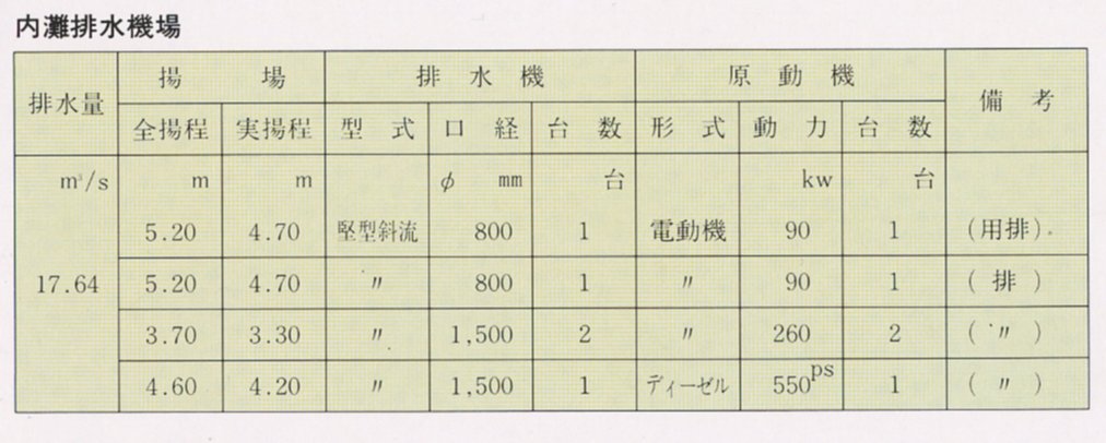 3ヶ所のポンプ場の能力は、表のとおりで、それぞれに、2台以上のポンプがあり、モーターで動くものと、ディーゼルエンジンで動くものがある。家庭で使われる井戸水のポンプなどとちがって、このような大型ポンプでは、くみ上げ量の調節がむずかしい。つまり能力10のポンプで1や2の水、14も15もの水はくめない。したがって、ポンプの運転台数で調節する方法がとられる。また、しょっちゅう動くポンプと洪水のときだけ動かすポンプがあり、たまにしか動かないポンプはディーゼルエンジンを使う、この方が経済的だからである。