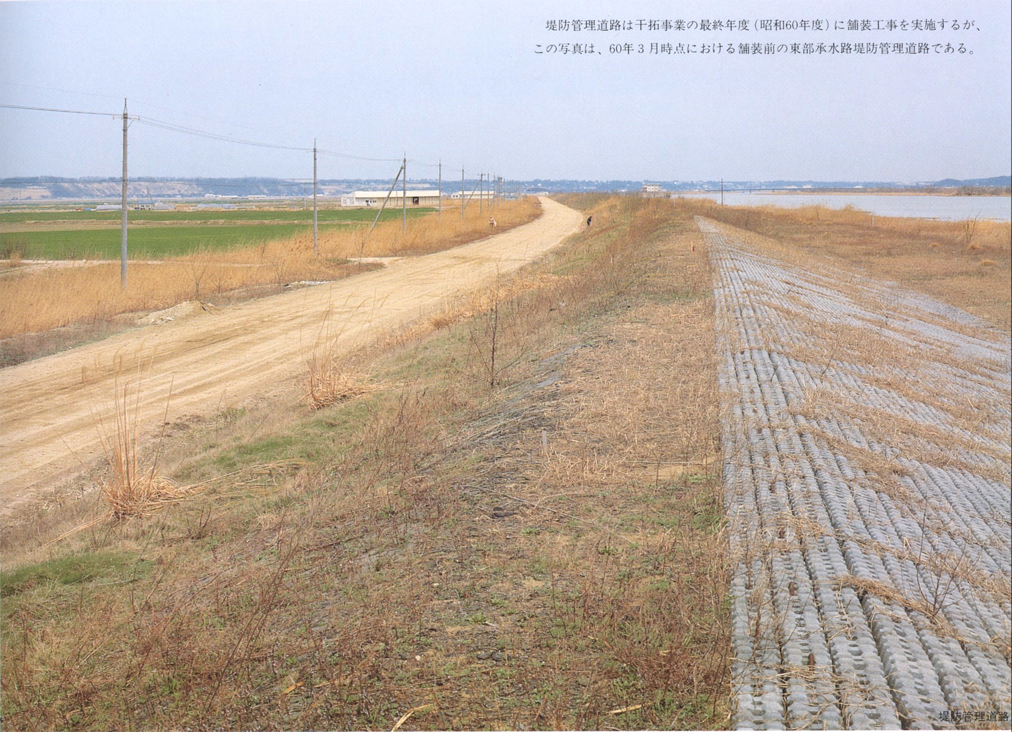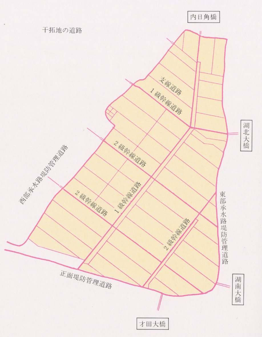 締切堤防をつくる際、管理道路の部分も含めたはばで砂が盛られた。したがって、一番最初にこの道路の形ができた。干拓地のあらゆる工事に使用される機械や資材は、すべて、干拓地の外から運びこまれたが、そのためにまずかけられた湖南、湖北の大橋と管理道路の果たした役割は大きい。