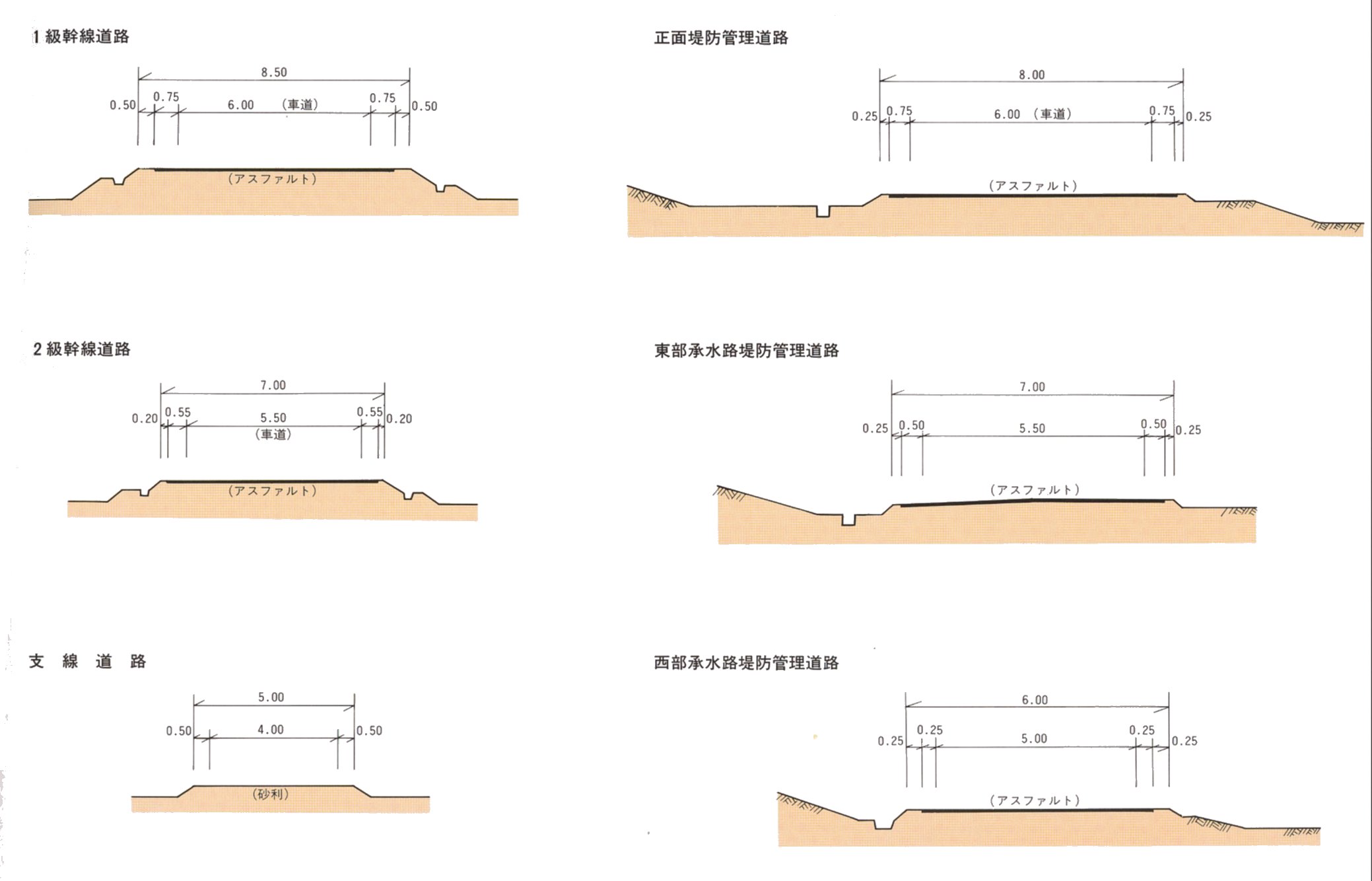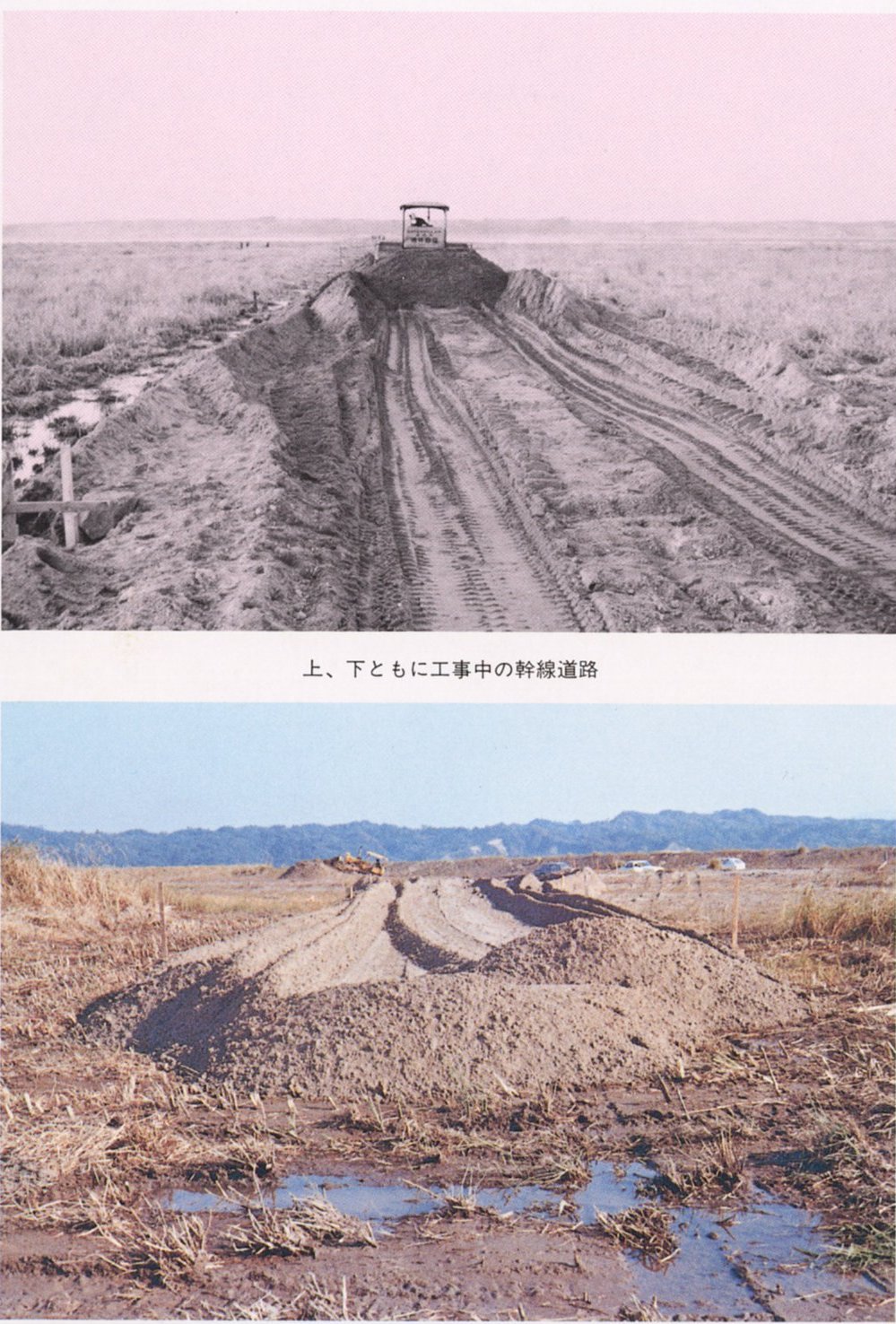 この管理道路に対して、干陸されたとはいえ、潟底のままの状態から始められたのが幹支線道路である。排水工事が進むにつれて、地面からヘドロも消えたが、もともと、この土は道路に不適当であったため、大量の砂を運びこんで、その土台を作った。