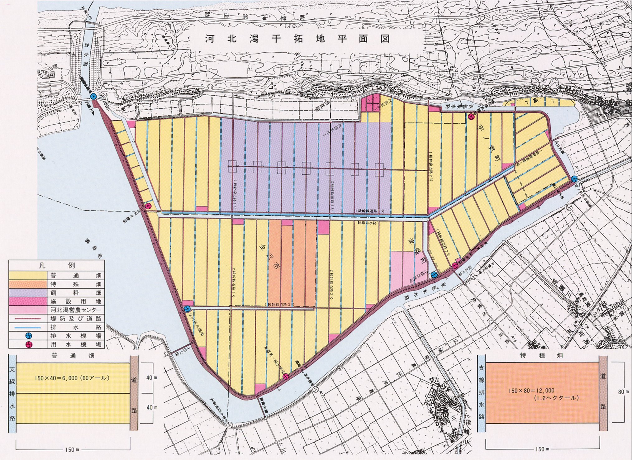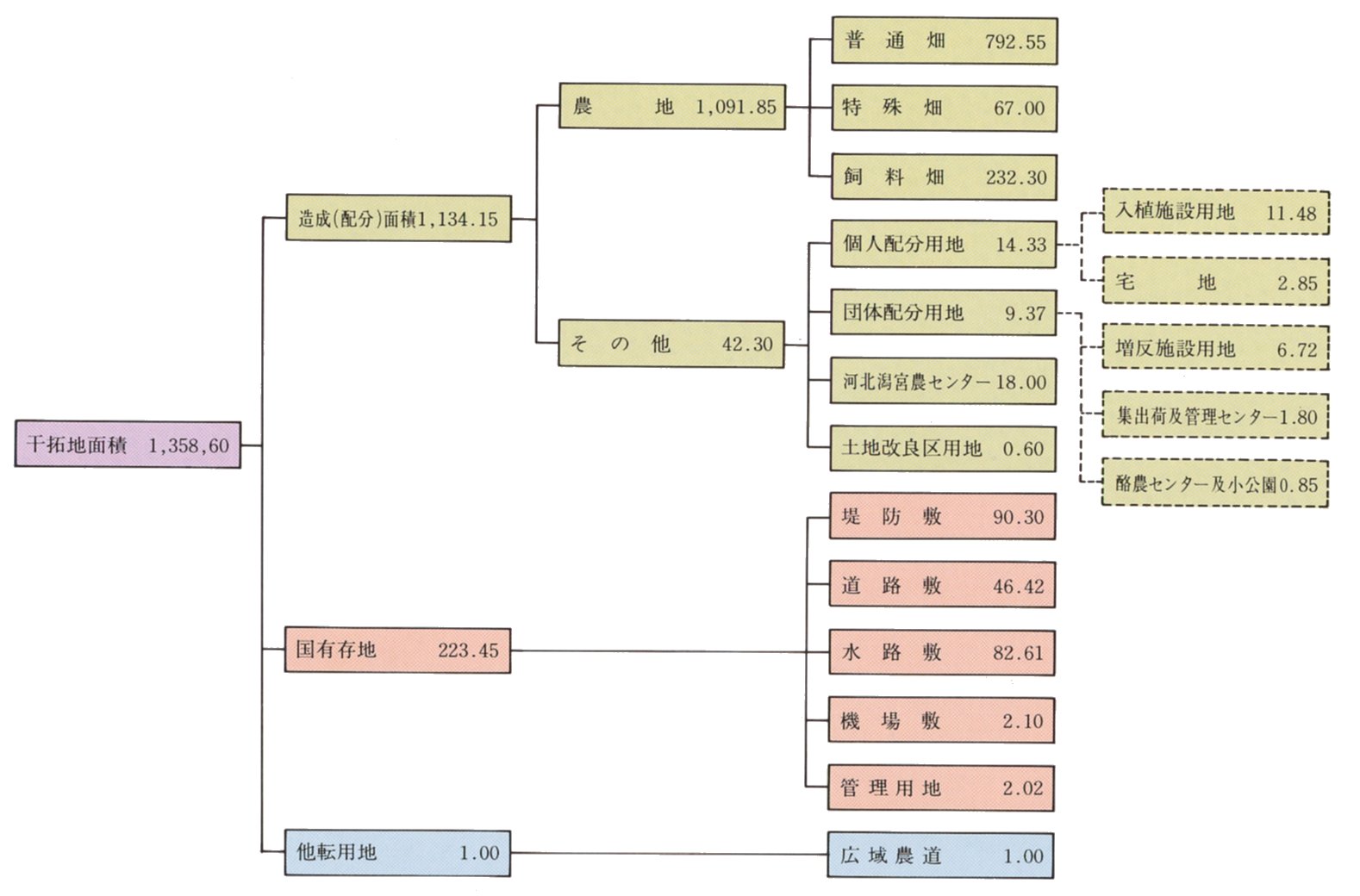 干拓面積1,359ヘクタールのうち、締切堤防、排水路、ポンプ場、道路等の面積を除き、約1,092ヘクタールが農地として利用できる。 面積の内訳は表のとおりで、特殊畑は、れんこんの栽培を目的とするもの、飼料畑は、乳牛飼育の牧草用である。また、入植とは、干拓地に住んで生活する酪農農家を指し、増反は、従前の農地に、干拓地の農地を加え、より大きな農地面積で農業を行う河北潟周辺農家を指す。
