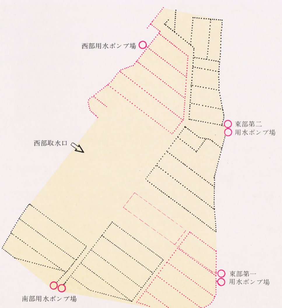 下の写真は、西部用水ポンプ場で他の三つのポンプ場も、これとほぼ同じ格好をしている。