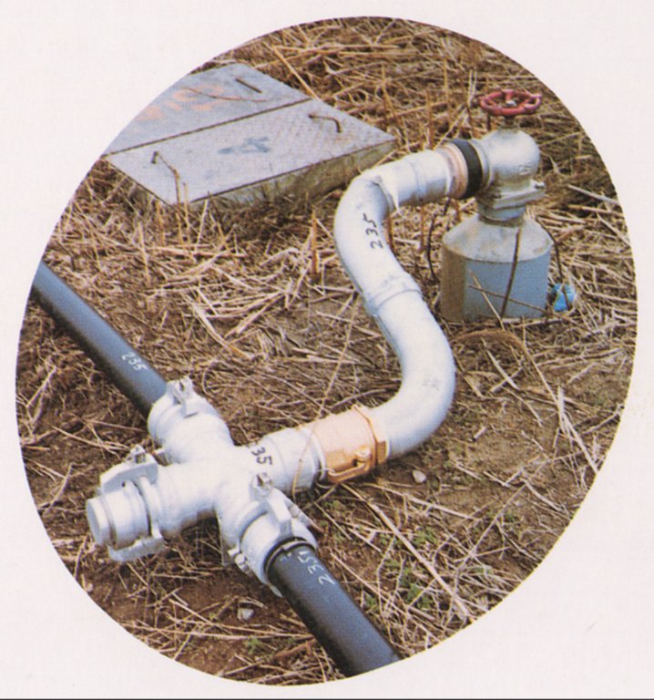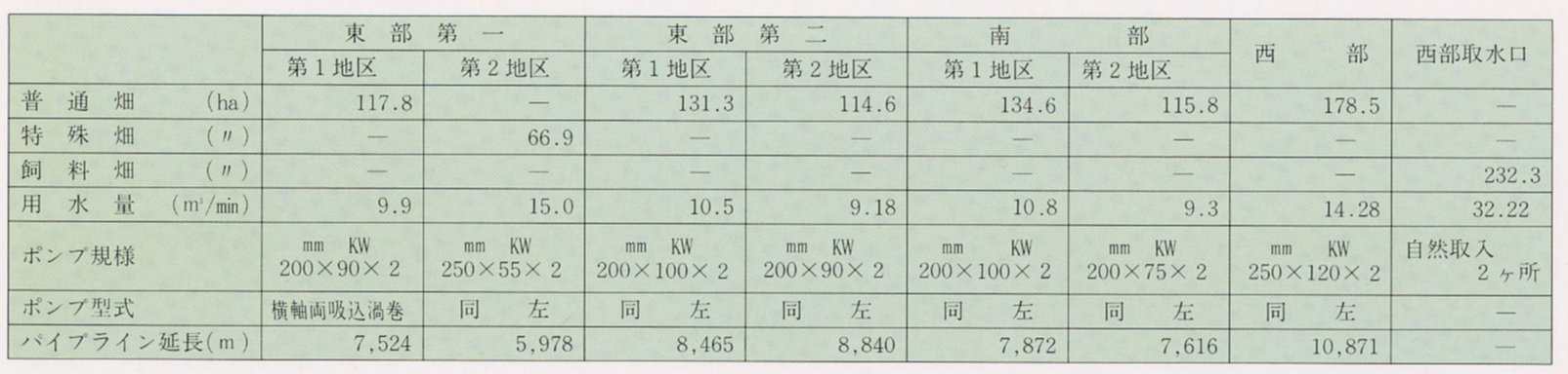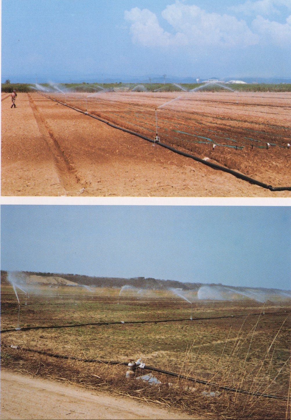 河北潟の干拓地では、この用水を雨のようにしてかける、これをスプリンクラーといって、水道の蛇口から出る水のような圧力で散水する。干拓地には、4ヶ所の用水ポンプ場があって、このポンプで圧力をかけた水が、水道管と同様、地下にうめられたパイプを通って、スプリンクラーを回す。
